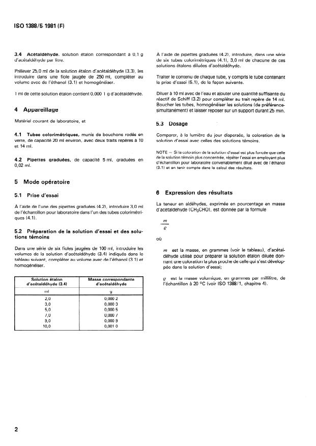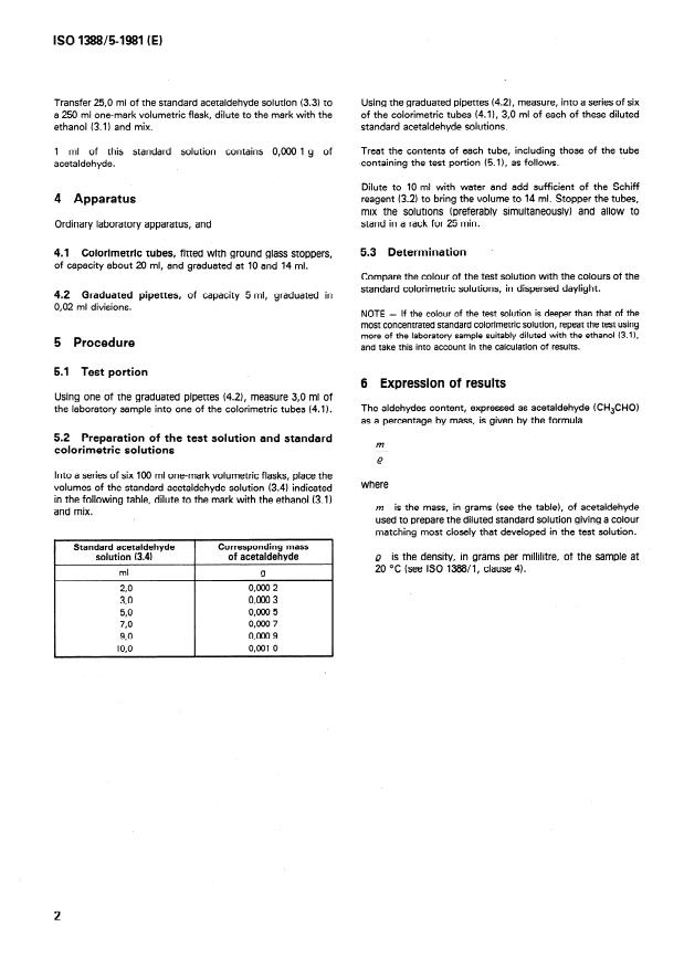 ISO 1388-5:1981 is a standard published by the International Organization for Standardization (ISO). Its full title is "Ethanol for industrial use - Methods of test - Part 5: Determination of aldehydes content - Visual colorimetric method". This standard covers: The method is applicable to products having aldehyde contents in the range 0.00025 % (m/m) to 0.00125 % (m/m). The principle is based on the reaction of the aldehydes present in a test portion with Schiff reagent. Visual comparison of the colour obtained with the colours of standard colorimetric solutions containing known quantities of acetaldehyde. - International Standards ISO 1388/1 to ISO 1377/12 cancel and replace ISO Recommendation R 1388-1970 of which they constitute a technical revision.
