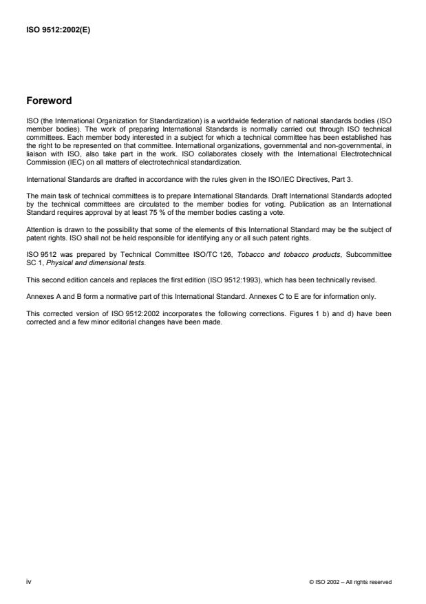 ISO 9512:2002 is a standard published by the International Organization for Standardization (ISO). Its full title is "Cigarettes - Determination of ventilation - Definitions and measurement principles". This standard covers: This International Standard specifies a method for the determination of ventilation which is applicable to cigarettes.