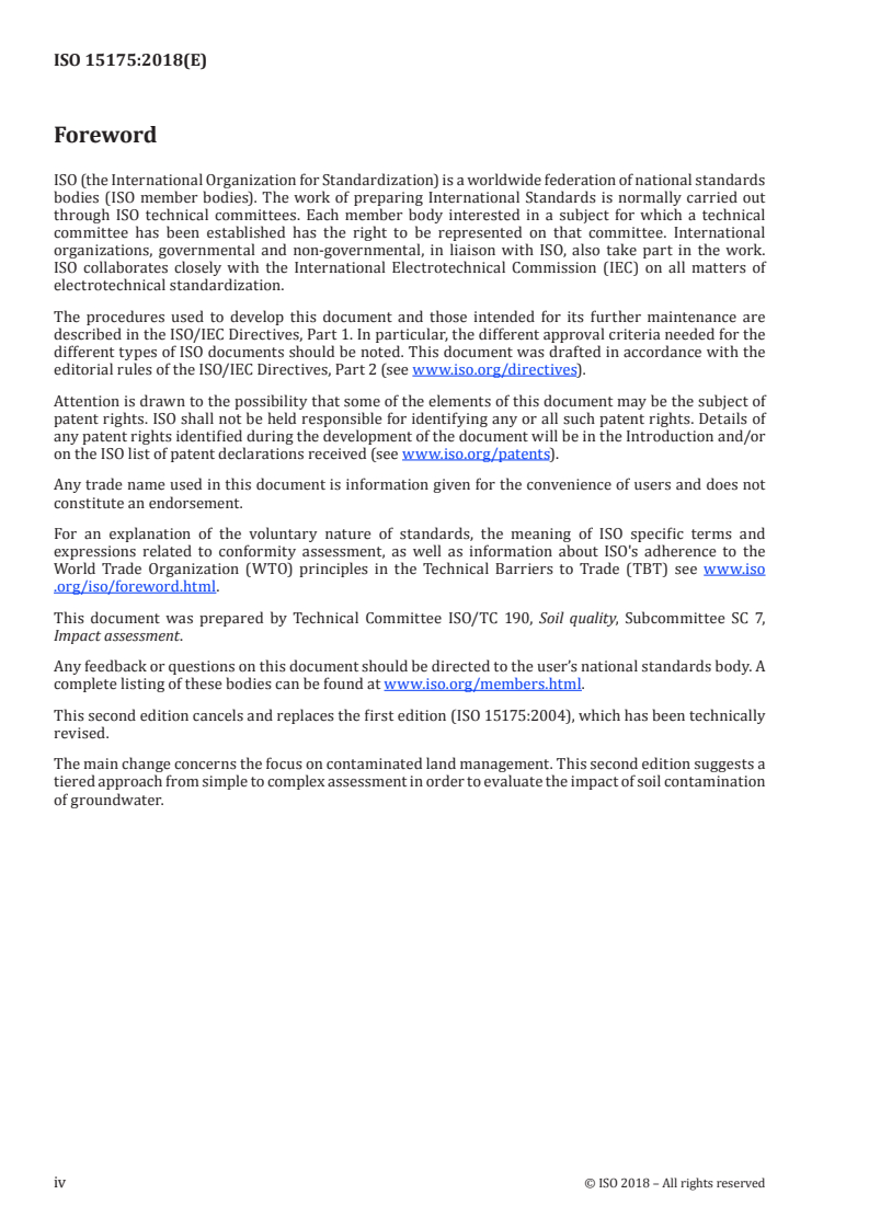ISO 15175:2018 is a standard published by the International Organization for Standardization (ISO). Its full title is "Soil quality - Characterization of contaminated soil related to groundwater protection". This standard covers: This document provides guidance on the principles behind, and main methods for, the evaluation of sites, soils and soil materials in relation to their role as a source of contamination of groundwater and their function in retaining, releasing and transforming contaminants. It is focused on contaminated land management identifying and listing relevant monitoring strategies, methods for sampling, soil processes and analytical methods.