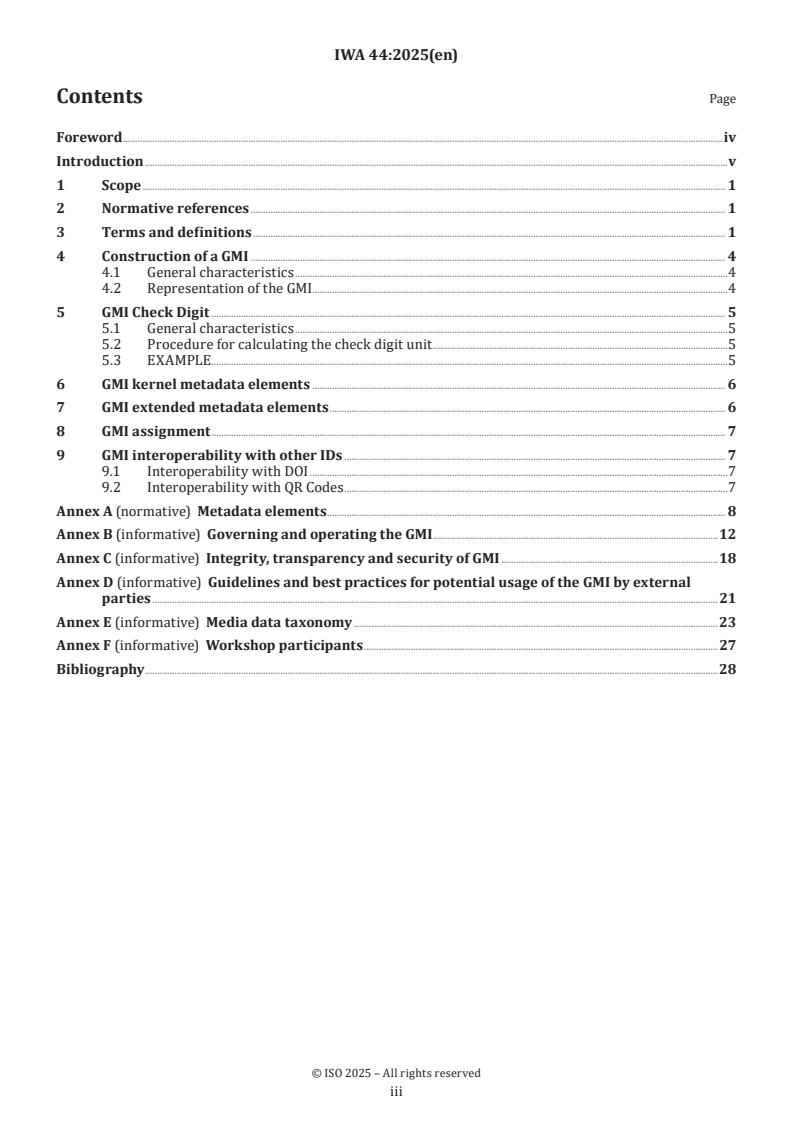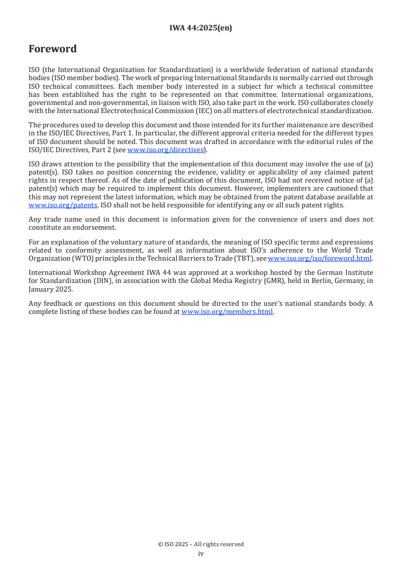 IWA 44:2025 is a standardization document published by the International Organization for Standardization (ISO). Its full title is "Global Media Identifier (GMI) for distribution channels and brands". This standard covers: This document provides requirements and recommendations for the structure and associated metadata to be included and the governance of the Global Media Identifier (GMI) that can be assigned to all media outlets that publish content online. The identification of material or physical objects is out of scope of this document. This document also considers the GMI’s technical infrastructure and its practical implementation. It is a neutral, non-judgemental numbering or naming convention, not a certification scheme. This document does not include any provisions for the assessment of online content, e.g. as regards its trustworthiness, quality, or an outlet’s conformance with journalistic standards.