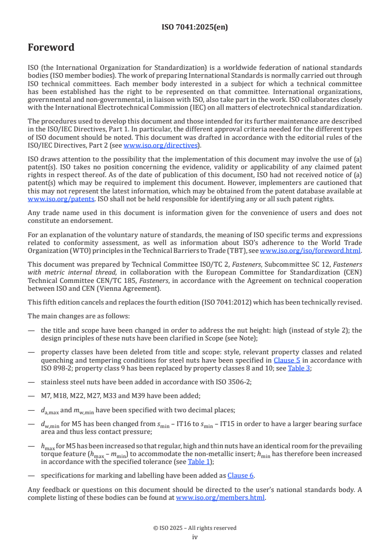 ISO 7041:2025 is a standard published by the International Organization for Standardization (ISO). Its full title is "Fasteners - Prevailing torque hexagon nuts - High nuts (with non-metallic insert)". This standard covers: This document specifies the characteristics of prevailing torque hexagon high nuts (with non‑metallic insert), in steel and stainless steel, with metric coarse pitch thread M5 to M39, and with product grades A and B. NOTE These nuts are designed with an overall height equal to mmin (as specified in ISO 898-2 and ISO 4033 for style 2) plus the prevailing torque feature. The height of the prevailing torque feature (hmax – mmin) for the non-metallic insert is identical for regular, high and thin nuts for a given diameter. If in certain cases other specifications are requested, property classes and stainless steel grades can be selected from ISO 898-2 or ISO 3506-2.