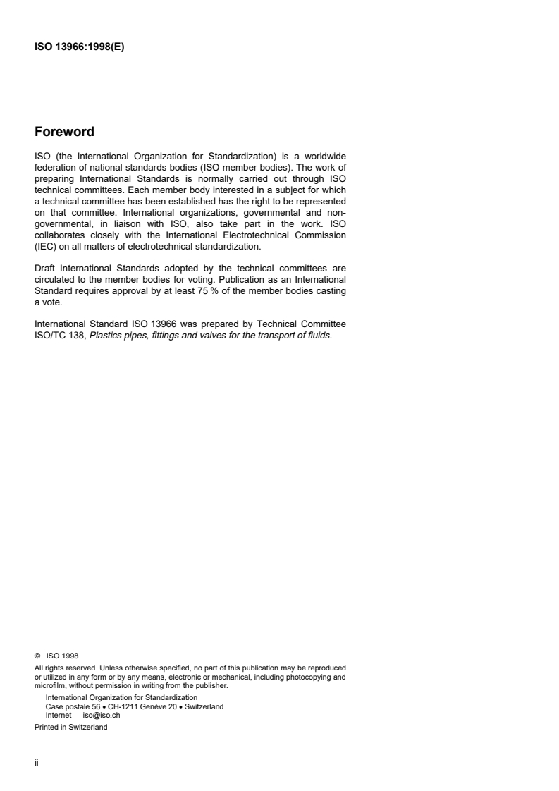 ISO 13966:1998 is an international standard developed by the International Organization for Standardization (ISO) that defines nominal ring stiffness classes for thermoplastics pipes and fittings. It applies specifically to components of thermoplastic pipe systems that have a circular cross-section. This standard is essential for manufacturers, engineers, and quality control professionals involved in the design, production, and evaluation of thermoplastic piping systems used in various fluid transport applications.
