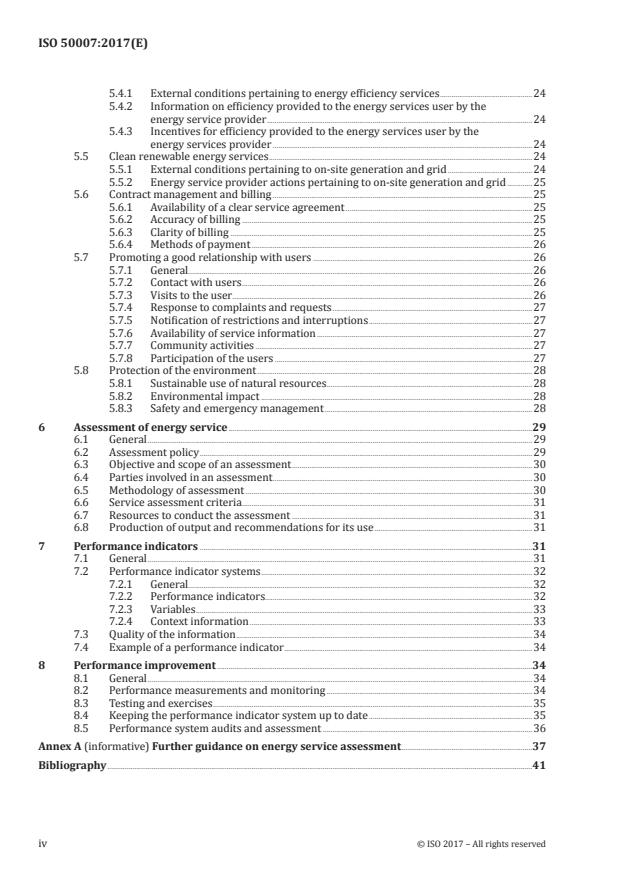 ISO 50007:2017 addresses the relevant elements of energy service provided by energy suppliers to users. It envisages energy service as including two broad categories: · energy supply/generation and distribution; · advice on and improvement to energy efficiency. ISO 50007:2017 provides best practice guidelines for energy service providers in order to continually improve their practices and quality of interaction with users. The following are within the scope of ISO 50007:2017: · definition of a language common to the different stakeholders; · definition of key components and characteristics of the energy service to users, with respect to their needs and expectations; · guidelines for satisfying users' needs and expectations; · assessment criteria for energy service to users; · introduction to performance indicators; · examples of performance indicators; · performance improvement; · education or training for users to understand the energy service provided by the energy service providers. The following are outside the scope of ISO 50007:2017: · topics relating to individual energy service, such as energy efficiency service provided to individual users of energy or services provided by energy service companies (ESCOs); · methods of design and construction of energy production, transmission and distribution systems; · management structure and methodology of operation and management of activities relating to energy services, including contracting with other energy service providers; · topics relating to energy services in systems inside buildings.