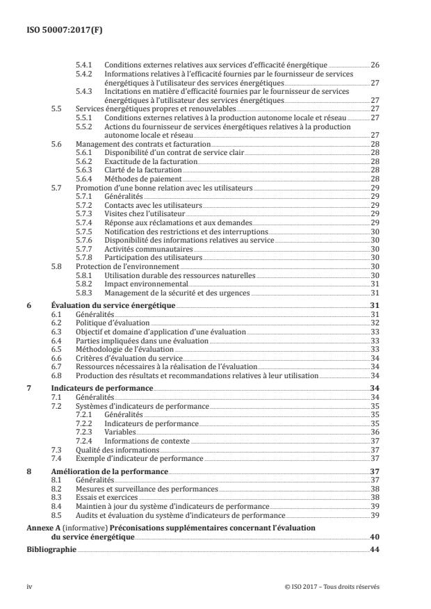 L'ISO 50007:2017 traite des éléments pertinents du service énergétique fourni par les fournisseurs d'énergie aux utilisateurs. Il envisage deux grandes catégories de services énergétiques: · l'approvisionnement en énergie/la production d'énergie et la distribution d'énergie; · le conseil et l'amélioration de l'efficacité énergétique. L'ISO 50007:2017 offre aux fournisseurs de services énergétiques des lignes directrices concernant les bonnes pratiques, afin de leur permettre d'améliorer continuellement leurs pratiques ainsi que la qualité de leurs échanges avec les utilisateurs. Les éléments suivants relèvent du domaine d'application de l'ISO 50007:2017: · la définition d'un langage commun aux différentes parties prenantes; · la définition des composantes et caractéristiques clés du service énergétique aux utilisateurs, en ce qui concerne les besoins et attentes de ces derniers; · les lignes directrices visant à répondre aux besoins et aux attentes des utilisateurs; · les critères d'évaluation du service énergétique aux utilisateurs; · la présentation des indicateurs de performance; · les exemples d'indicateurs de performance; · l'amélioration de la performance; · la sensibilisation ou la formation afin que les utilisateurs comprennent le service énergétique fourni par les fournisseurs de services énergétiques. Les éléments suivants ne relèvent pas du domaine d'application de l'ISO 50007:2017: · les sujets liés à des services énergétiques particuliers tels que les services d'efficacité énergétique offerts aux utilisateurs individuels d'énergie ou les services fournis par des sociétés de services énergétiques; · les méthodes de conception et de construction des systèmes de production, de transport et de distribution d'énergie; · la structure de management et la méthodologie de conduite et de management des activités liées aux services énergétiques, y compris la passation de marché avec d'autres fournisseurs de services énergétiques; · les sujets liés aux services énergétiques dans les systèmes installés à l'intérieur de bâtiments.