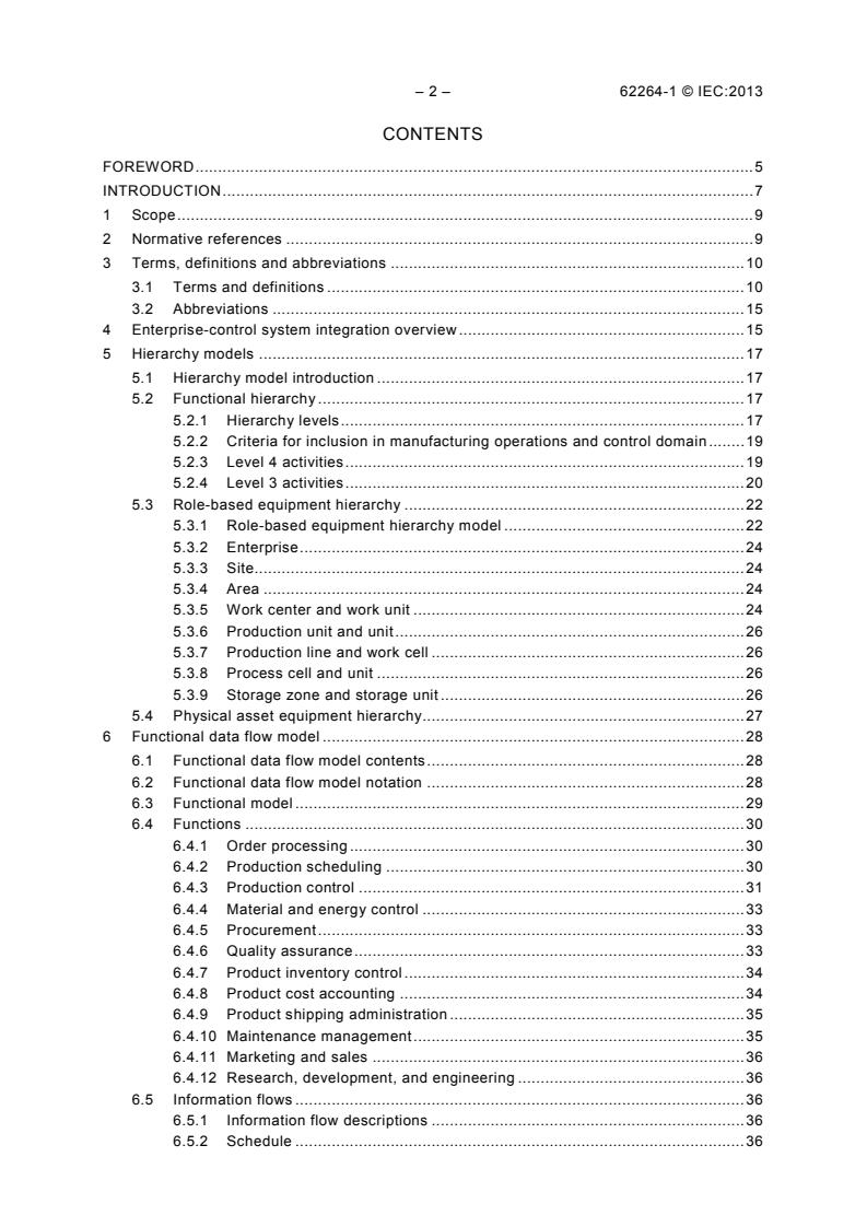 IEC 62264-1:2013 is a standard published by the International Organization for Standardization (ISO). Its full title is "Enterprise-control system integration - Part 1: Models and terminology". This standard covers: IEC 62264-1:2013 describes the manufacturing operations management domain (Level 3) and its activities, and the interface content and associated transactions within Level 3 and between Level 3 and Level 4. This description enables integration between the manufacturing operations and control domain (Levels 3, 2, 1) and the enterprise domain (Level 4). Its goals are to increase uniformity and consistency of interface terminology and reduce the risk, cost, and errors associated with implementing these interfaces. IEC 62264-1 can be used to reduce the effort associated with implementing new product offerings. This second edition cancels and replaces the first edition published in 2003. It constitutes a technical revision and includes the following significant technical changes with respect to the previous edition: - the functional hierarchy in 5.2 was extended using the definitions from IEC 62264-3; - the equipment hierarchy in 5.3 was extended using the definitions from IEC 62264-3; - a physical asset equipment model was added in 5.3; - the generic model of manufacturing operations management categories in Clause 7 was added using information from IEC 62264-3; - the formal UML models that were in Clause 7 were moved to IEC 62264-2 and the remaining data definitions are now in Clause 8; - the capacity and capability model in Clause 8 was extended; - new Annexes A and B were moved from IEC 62264-3; - Subclause 5.5 on the decision hierarchy was removed and a reference added to ISO 15704; - Annex C, D, E were moved to a Technical Report; - Annex F was removed.