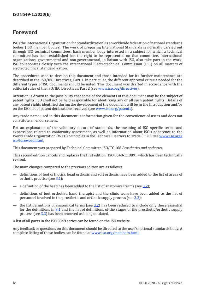 ISO 8549-1:2020 is a standard published by the International Organization for Standardization (ISO). Its full title is "Prosthetics and orthotics - Vocabulary - Part 1: General terms for external limb prostheses and external orthoses". This standard covers: This document defines general terms used to describe external limb prostheses and orthoses, and the personnel involved in the practice of prosthetics and orthotics. NOTE 1 The complete range of levels of limb amputation are listed and defined in ISO 8549-2. The complete range of classes of orthoses are listed and defined in ISO 8549-3. This document does not apply to breast, ocular or other external prostheses used to replace other parts of the human body, nor to dental prostheses or orthoses. NOTE 2 For the purposes of this document, the abbreviated term 'prosthetics' and its derivatives only apply to external limb prosthetics. The abbreviated term 'orthotics' and its derivatives only apply to external orthotics.