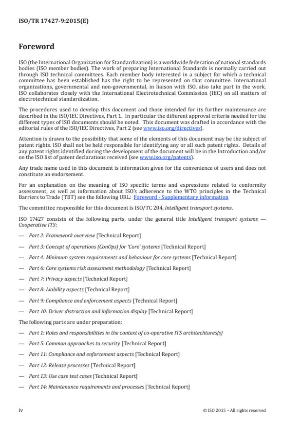 ISO/TR 17427-9:2015 is a technical report published by the International Organization for Standardization (ISO). Its full title is "Intelligent transport systems - Cooperative ITS - Part 9: Compliance and enforcement aspects". This standard covers: ISO 17427-9:2015 identifies potential critical compliance and enforcement aspects issues that C-ITS service provision may face or introduce; to consider strategies for how to identify, control, limit or mitigate such issues. The objective of this Technical Report is to raise awareness of and consideration of such issues and to give pointers, where appropriate, to standards deliverables existing that provide specifications for all or some of these aspects. This Technical Report does not provide specifications for solutions of these issues.