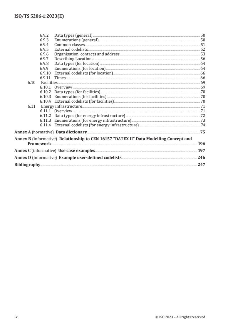 - Annexes: Annex A is a normative data dictionary; Annex B maps the model to CEN 16157 (DATEX II); Annex C provides use cases and Annex D example codelists.