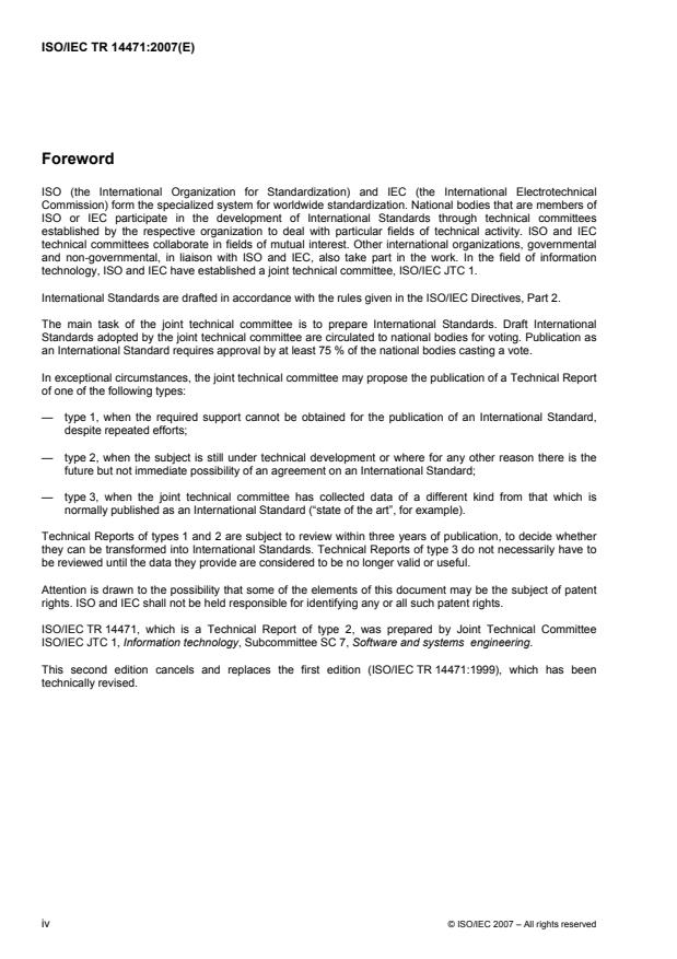 ISO/IEC TR 14471:2007 has the following relationships with other standards: It is inter standard links to ISO/IEC TR 14471:1999. Understanding these relationships helps ensure you are using the most current and applicable version of the standard.