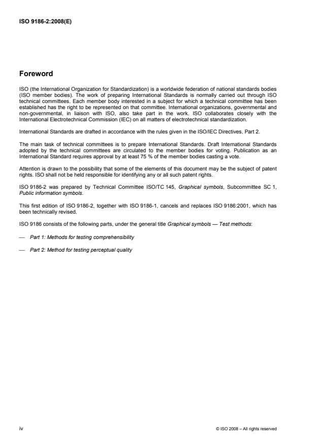 ISO 9186-2:2008 is a standard published by the International Organization for Standardization (ISO). Its full title is "Graphical symbols - Test methods - Part 2: Method for testing perceptual quality". This standard covers: ISO 9186-2:2008 specifies a method for testing the perceptual quality of graphical symbols, to verify that the elements that constitute a graphical symbol are readily identifiable by the eventual user population.