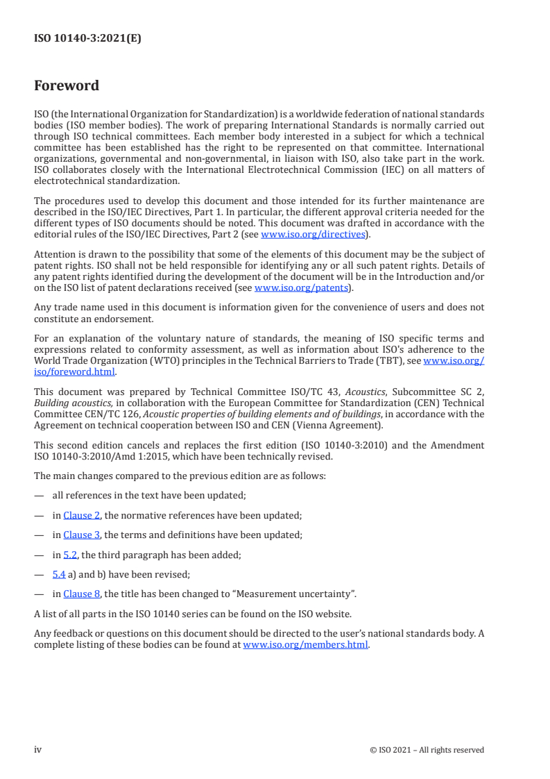ISO 10140-3:2021 is a document that outlines laboratory methods for measuring the impact sound insulation of floor assemblies. The test results can be used to compare sound insulation properties, classify building elements, design products with specific acoustic properties, and estimate performance in real buildings. The measurements are conducted in test facilities that suppress sound transmission through flanking paths. However, these measurements cannot be directly applied to real-world situations without considering other factors that affect sound insulation. The document specifies a test method using a standard tapping machine to simulate impact sources like human footsteps. It also provides alternative test methods for simulating impact sources with strong low frequency components. The document is applicable to all types of floors and floor coverings but only for laboratory measurements.