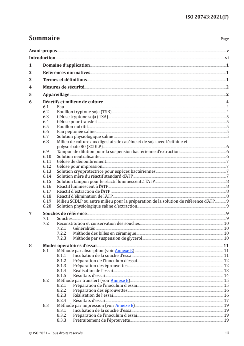 - Supporting content: Procedures for strain handling and storage (Clause 7, Annex A), safety precautions, required apparatus, reagents and media, and example test workflows (Annex E).
