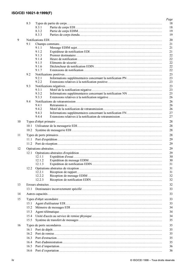 ISO/IEC 10021-9:1999 is a standard published by the International Organization for Standardization (ISO). Its full title is "Information technology - Message Handling Systems (MHS): Electronic Data Interchange Messaging System - Part 9:". This standard covers: This Recommendation | International Standard is one of a series on message handling. The entire set provides a comprehensive blueprint for a Message Handling System (MHS) realized by any number of cooperating open systems. The purpose of an MHS is to enable users to exchange messages on a store-and-forward basis. A message submitted on behalf of one user, the originator, is conveyed by the Message Transfer System (MTS) and subsequently delivered to the agents of one or more additional users, the recipients. Access Units (AU) link the MTS to communication systems of other kinds (e.g. postal systems). A user is assisted in the preparation, storage, and display of messages by a User Agent (UA). Optionally, it is assisted in the storage of messages by a Message Store (MS). The MTS comprises a number of Message Transfer Agents (MTA) which collectively perform the store-and-forward message transfer function. This Recommendation | International Standard defines the message handling application called EDI messaging (EDIMG), a form of message handling tailored for exchange of Electronic Data Interchange (EDI) information, a new message content type and associated procedures known as Pedi. It is designed to meet the requirements of users of ISO 9735 (EDIFACT), and other commonly used EDI systems. This Recommendation | International Standard is one of a series on message handling. ITU-T Rec. X.402 | ISO/IEC 10021-2 constitutes the introduction to the series and identifies the other documents in it. The architectural basis and foundation for message handling are defined in still other Recommendations | International Standards. ITU-T Rec. X.402 | ISO/IEC 10021-2 identifies those documents as well.