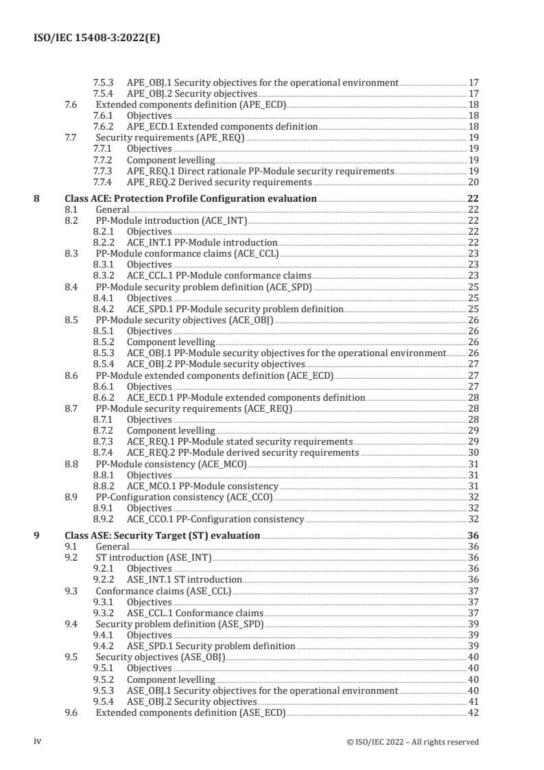 - Evaluation criteria for PPs, PP‑Modules, PP‑Configurations and STs: includes classes such as APE (Protection Profile evaluation), ACE (PP‑Module/Configuration evaluation) and ASE (Security Target evaluation) with specific component objectives (e.g., introductions, conformance claims, problem definitions, objectives, requirements and consistency checks).