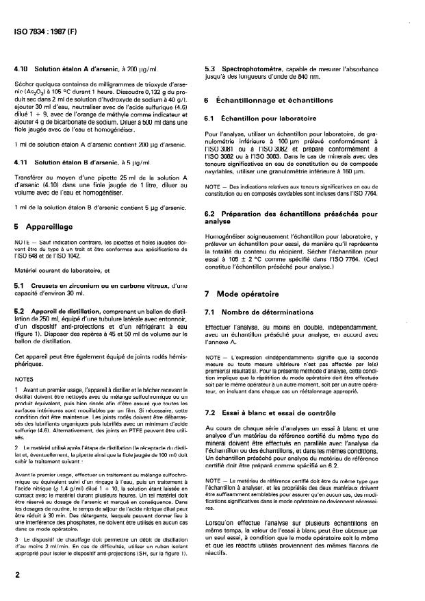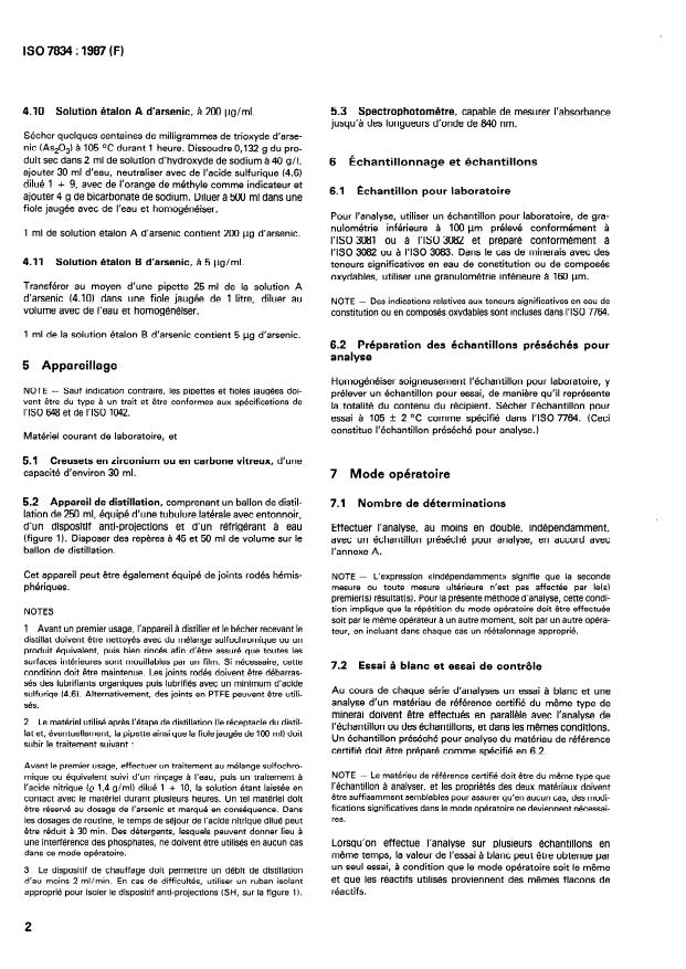 ISO 7834:1987 is a standard published by the International Organization for Standardization (ISO). Its full title is "Iron ores - Determination of arsenic content - Molybdenum blue spectrophotometric method". This standard covers: The method ist applicable to a concentration range of 0,0001 to 0,1 % (m/m) (1 bis 1000 /g) of arsenic in natural iron ores, and iron ore concentrates and agglomerates including sinter products. Specifies principle, reagents, apparatus, sampling and samples, procedure, expression of results, and test report. Includes three annexes. A figure shows the arsenic distillation apparatus.