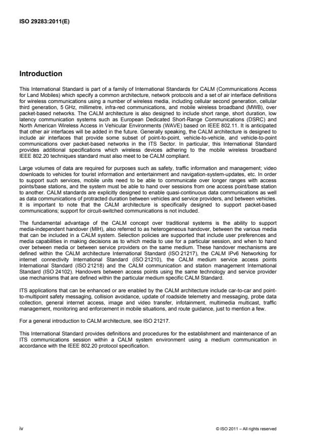 ISO 29283:2011 is a standard published by the International Organization for Standardization (ISO). Its full title is "ITS CALM Mobile Wireless Broadband applications using Communications in accordance with IEEE 802.20". This standard covers: ISO 29283:2011 specifies the options appropriate for CALM using mobile wireless broadband (MWB) techniques conforming to the IEEE 802.20 air interface and protocol specification recommended by ITU-R M.1801, and specifies the management interface requirements. CALM links are required for quasi-continuous, prolonged and short duration communications between vehicles and the roadside, between vehicles, and between mobile equipment and fixed infrastructure points, over medium and long ranges. Wherever practicable, ISO 29283:2011 has been developed by reference to suitable extant standards, adopted by selection. Required regional variations are provided. Application specific upper layers are not included in ISO 29283:2011, but will be driven by application standards.