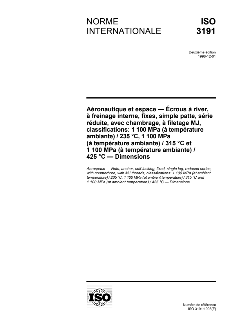 ISO 3191:1998 is a standard published by the International Organization for Standardization (ISO). Its full title is "Aerospace - Nuts, anchor, self-locking, fixed, single lug, reduced series, with counterbore, with MJ threads, classifications: 1 100 MPa (at ambient temperature)/235 degrees C, 1 100 MPa (at ambient temperature)/315 degrees C and 1 100 MPa (at ambient temperature)/425 degrees C - Dimensions". This standard covers: This International Standard specifies the dimensions of self-locking, fixed, single lug anchor nuts, reduced series, with counterbore, with MJ threads, for classifications: 1 100 MPa1)/235 °C2), 1 100 MPa1)/315 °C2) and 1 100 MPa1)/425 °C2). This International Standard is only applicable for the compilation of aerospace product standards.