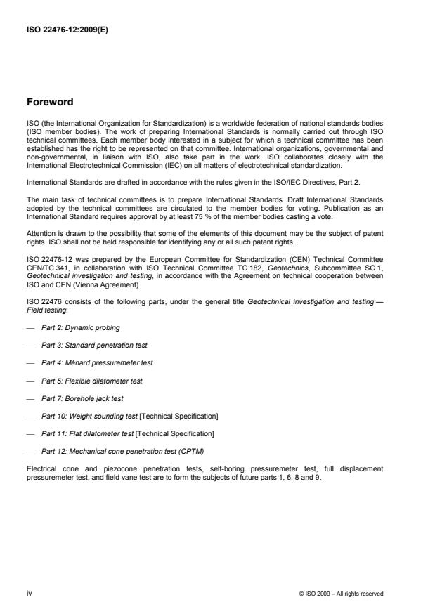ISO 22476-12:2009 is a standard published by the International Organization for Standardization (ISO). Its full title is "Geotechnical investigation and testing - Field testing - Part 12: Mechanical cone penetration test (CPTM)". This standard covers: ISO 22476-12:2009 specifies a mechanical cone penetration test (CPTM), including equipment requirements, execution and reporting. The results from such geotechnical testing are especially suited to the qualitative and/or quantitative determination of a soil profile - together with direct investigations - or as a relative comparison with other in situ tests. The results from a cone penetration test can in principle be used to evaluate stratification, soil type, and geotechnical parameters such as soil density, shear‑strength parameters and deformation and consolidation characteristics. ISO 22476-12:2009 specifies the following features: type of cone penetration test; application class; penetration length or penetration depth; elevation of the ground surface or underwater ground surface at the location of the cone penetration test with reference to a datum; location of the cone penetration test relative to a reproducible fixed location reference point.