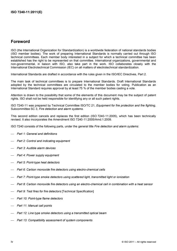 ISO 7240-11:2011 is a standard published by the International Organization for Standardization (ISO). Its full title is "Fire detection and alarm systems - Part 11: Manual call points". This standard covers: ISO 7240-11:2011 specifies the requirements, test methods and performance criteria for manual call points in fire detection and alarm systems in and around buildings (see ISO 7240‑1). It takes into account indoor and outdoor conditions, the appearance and operation of the manual call points for type A "direct operation" and type B "indirect operation", and covers those which are simple mechanical switches, those which are fitted with simple electronic components (e.g. resistors, diodes) and those which contain active electronic components and which work with the control and indicating equipment for signalling and identifying, for example, an address or location. ISO 7240-11:2011 does not cover manual call points for special applications, for example manual call points that are intrinsically safe or for use in hazardous conditions, if such applications require additional or other requirements or tests than those given in ISO 7240-11:2011.