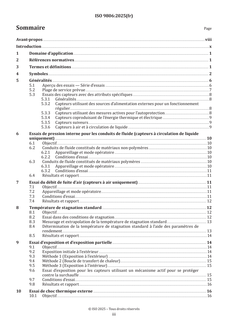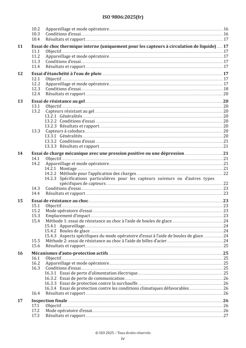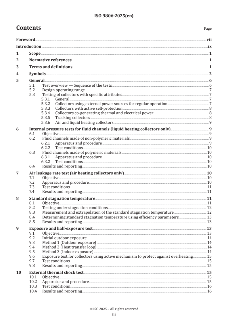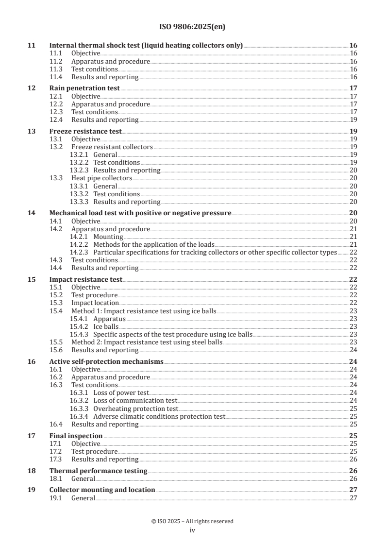 ISO 9806:2025 organizes testing around the collector lifecycle and performance attributes. Major technical topics include: