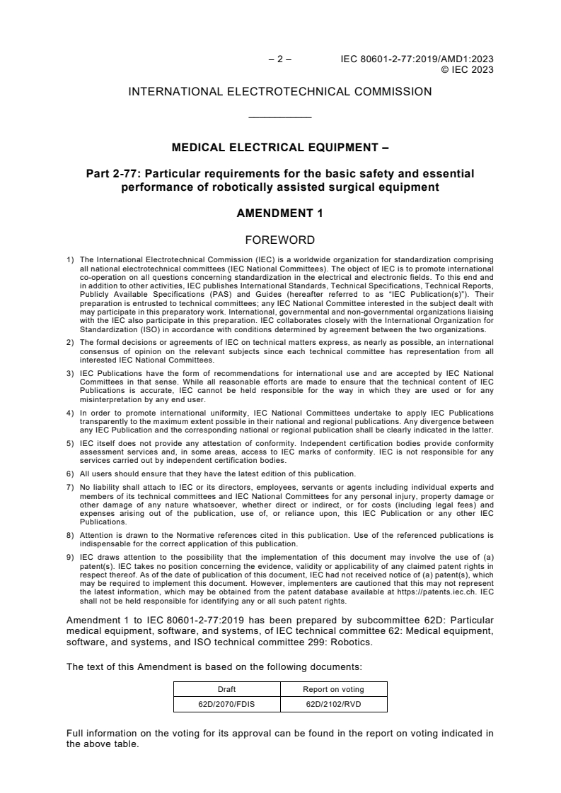 IEC 80601-2-77:2019/FDAmd 1 - Medical electrical equipment — Part 2-77: Particular requirements for the basic safety and essential performance of robotically assisted surgical equipment — Amendment 1 Released:24. 08. 2023
