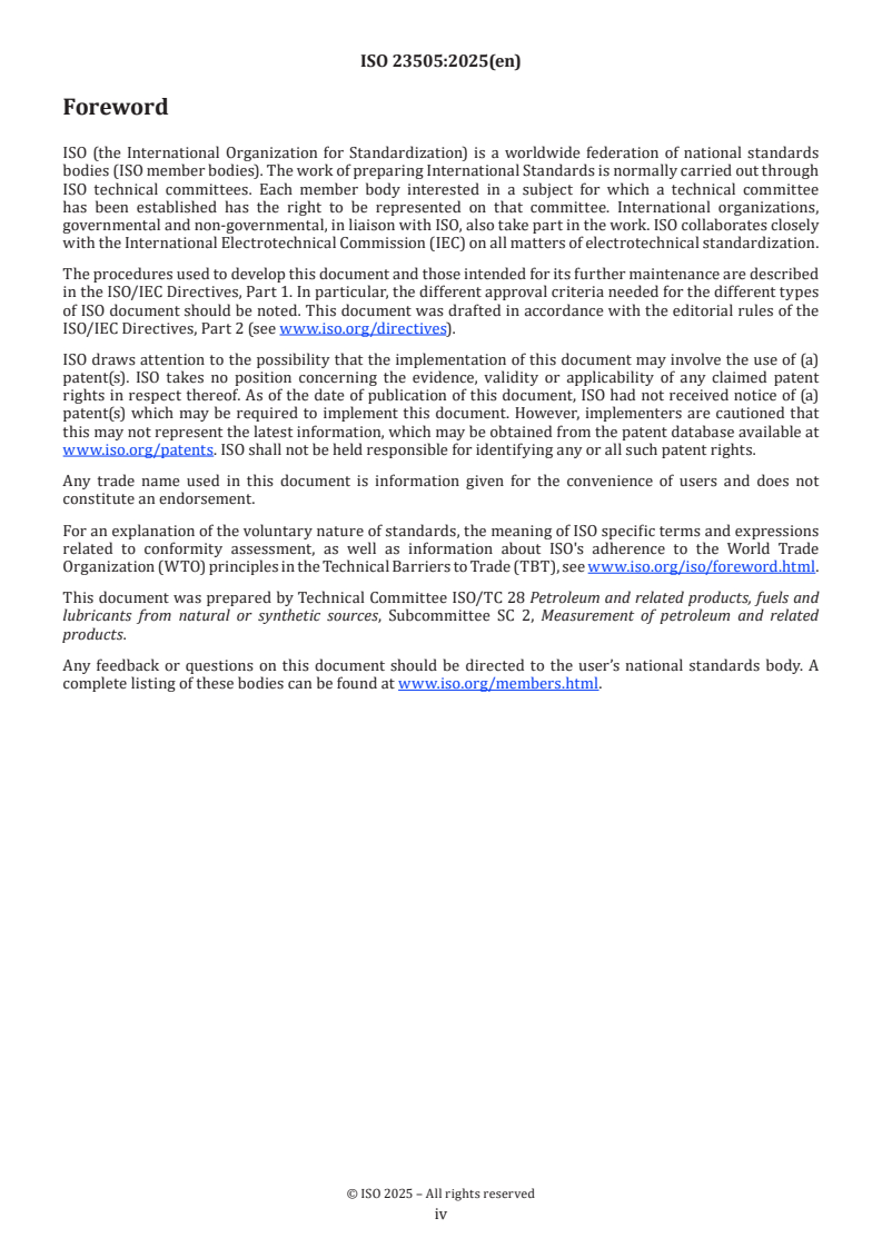 ISO 23505:2025 is a standard published by the International Organization for Standardization (ISO). Its full title is "Petroleum and liquid petroleum products - Calibration of spherical tanks - External electro-optical distance-ranging method". This standard covers: This document specifies a method for the calibration of spherical tanks with a radius greater than 1 m by means of external measurements using an electro-optical distance-ranging instrument (EODR). It also specifies the subsequent calculation and the compilation of tank capacity tables. This document applies to spherical tanks built above ground, that are non-insulated, single-shell and with a radial variation up to 1 %. The method specified in this document can also apply to spherical tanks built above the deck when the carrying ship is in the dock. This document does not apply to the calibration of spheroidal tanks.