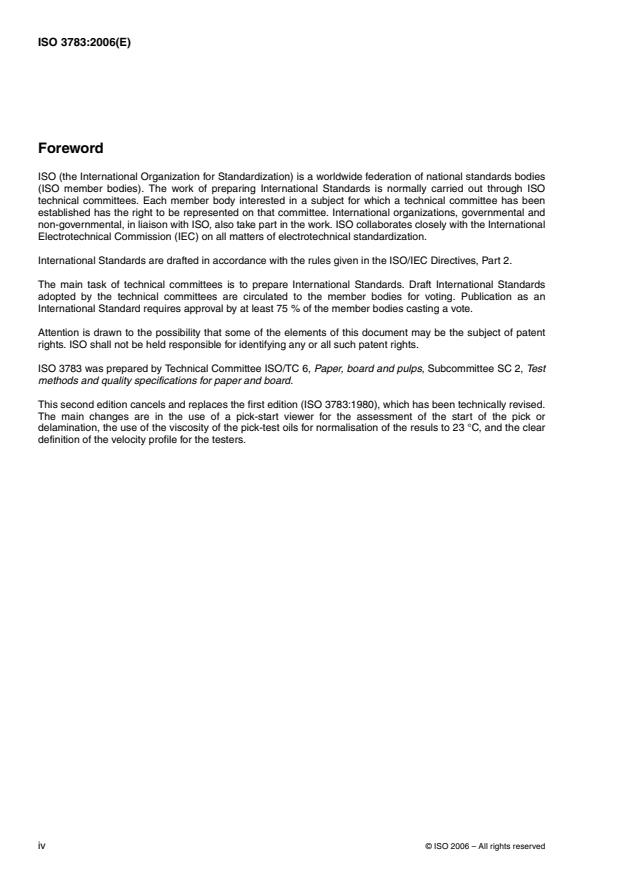 ISO 3783:2006 specifies an accelerated speed method for measuring the surface strength of paper and board by simulating printing conditions using an IGT-type tester (electric model). The method determines pick velocity and pick resistance for coated and uncoated papers, and delamination resistance for liners on paperboard. Tests use pick‑test oils of known viscosity at a reference temperature (23 °C) and progressively increasing printing velocity to find the point where surface damage (“picking”) or delamination begins. Note: the method tests a limited area and normally will not detect isolated local imperfections.