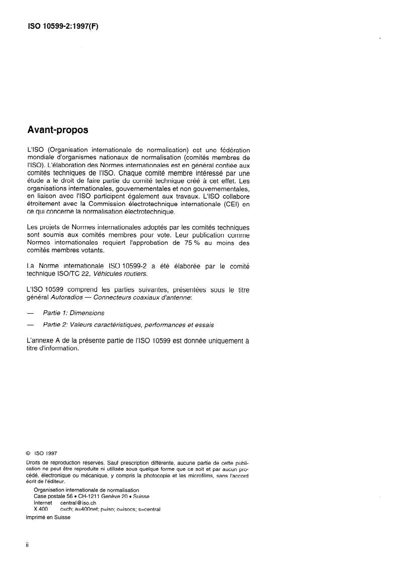 ISO 10599-2:1997 - Car radios — Coaxial aerial connectors — Part 2: Characteristic values, performance requirements and tests Released:5/22/1997