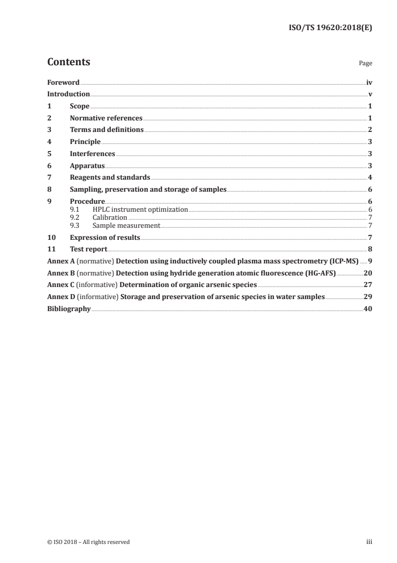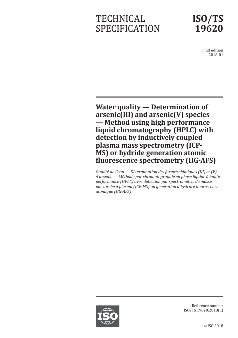 ISO/TS 19620:2018 - Water quality -- Determination of arsenic(III) and arsenic(V) species -- Method using high performance liquid chromatography (HPLC) with detection by inductively coupled plasma mass spectrometry (ICP-MS) or hydride generation atomic fluorescence spectrometry (HG-AFS)