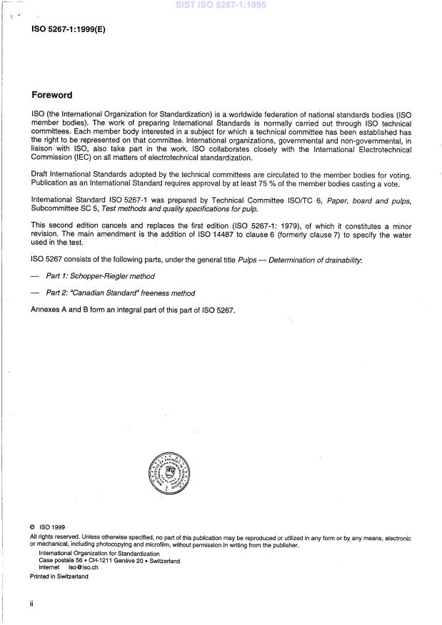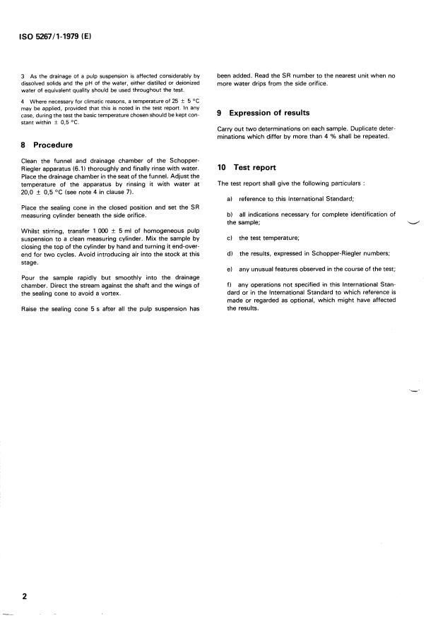 ISO 5267-1:1979 is a standard published by the International Organization for Standardization (ISO). Its full title is "Pulps — Determination of drainability — Part 1: Schopper-Riegler method". This standard covers: Pulps — Determination of drainability — Part 1: Schopper-Riegler method