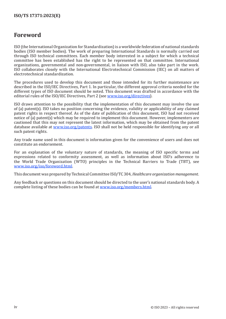 ISO/TS 17371:2023 is a technical specification published by the International Organization for Standardization (ISO). Its full title is "Healthcare organization management - Infection prevention and control (IPC) measures for cross-border workers". This standard covers: This document specifies the infection prevention and control (IPC) measures for cross-border workers. It is applicable only in the circumstance of novel infectious disease outbreak while valid vaccine or drug for treatment are not available. It can be used for the purpose of maintaining economic activities when a country that workers need to enter blocks its border due to a pandemic or epidemic (Annex A). This document provides information on the key aspects and details of the process requirements, procedures for selecting service providers, such as travel management company, and procedures for cross-border workers amidst a pandemic, encompassing the complete set of stages from ‘pre-departure’, ‘border crossing’, ‘quarantine and commute’, to ‘return’, and is addressed to all stakeholders involved in travel, whether from the public or private sector. NOTE Stakeholders are comprised of but not limited to health authority, healthcare organization and screening stations, accommodation services, transportation services, travel agencies, and private companies including their contractors and providers.