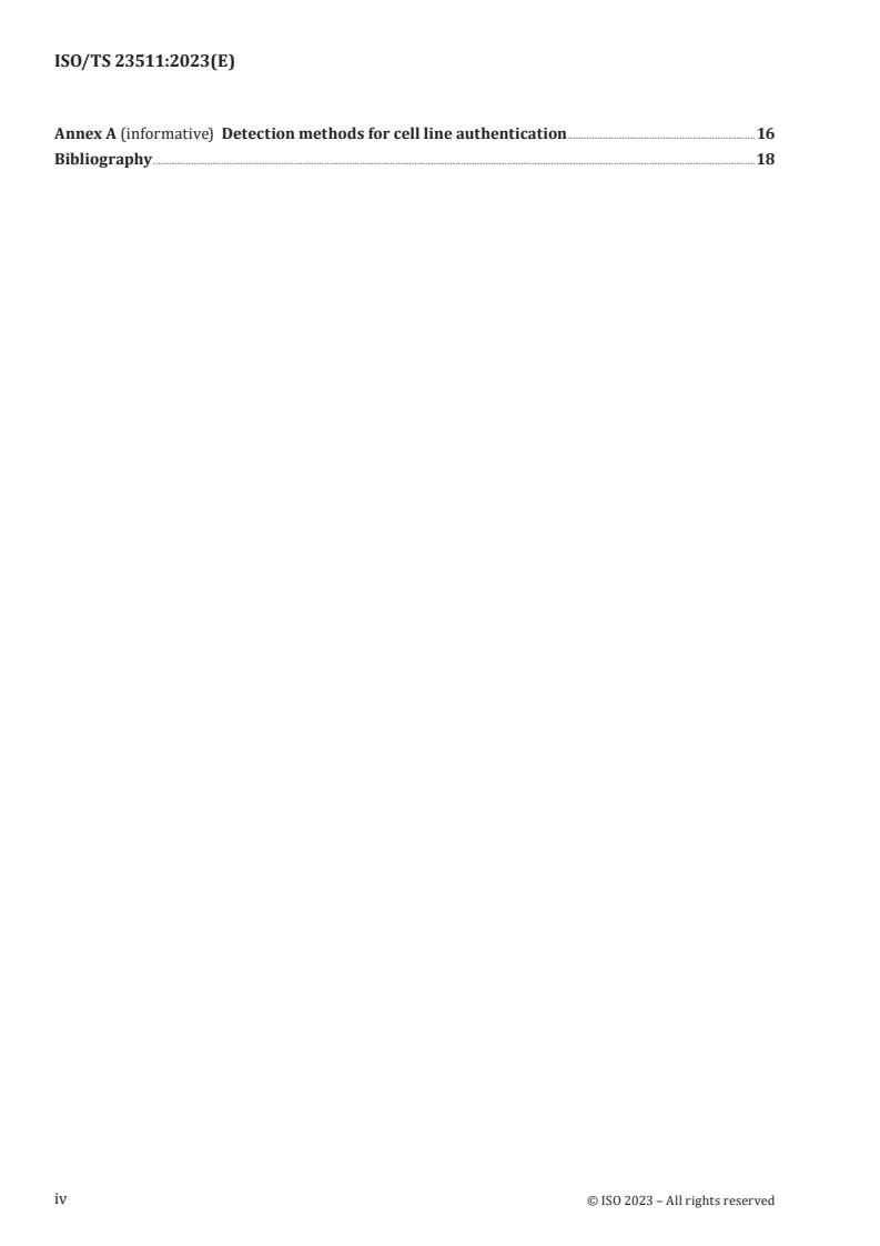 ISO/TS 23511:2023 is a technical specification published by the International Organization for Standardization (ISO). Its full title is "Biotechnology - General requirements and considerations for cell line authentication". This standard covers: This document defines terms related to cell line authentication in the field of biotechnology. It describes the general principles, detection strategies and analytical methods for cell line authentication. It specifies requirements and key considerations for method selection, quality control parameters, data analysis and reporting. This document is applicable to routine inspection of cell lines in culture and in storage in the fields of basic research, translational studies and product manufacturing. It is also applicable to cell line origin validation in academic and industrial laboratories, cell banks and manufacturing sites. It is primarily applicable to mammalian cells, including human cells. This document does not apply to non-animal cells (e.g. microbial contamination, plant cells), nor to cells in complex matrices (e.g. tissues, organs, organoids, plants).