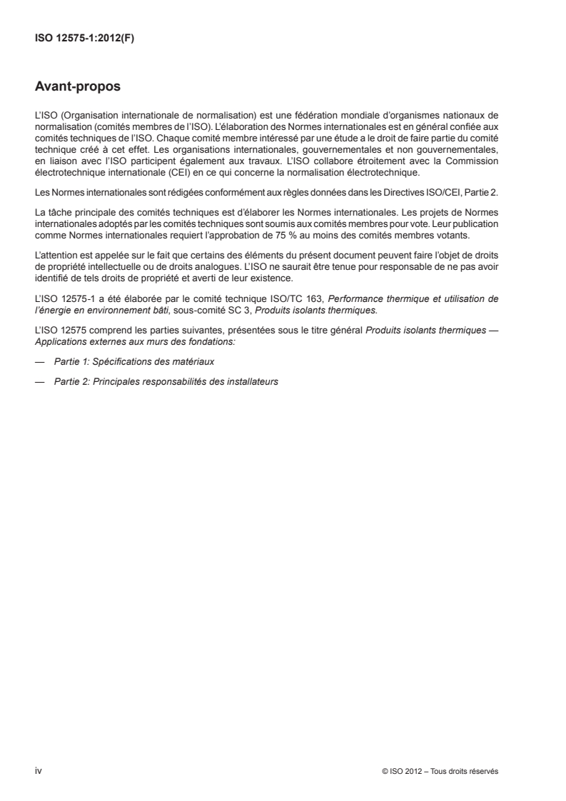 ISO 12575-1:2012 specifies the basic performance requirements for the insulating materials that form part of insulating systems used on the exterior of foundations and slabs where the insulation is in direct contact with the ground. ISO 12575-1:2012 does not address exterior insulating systems for foundations permanently immersed in water.