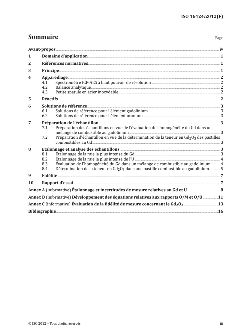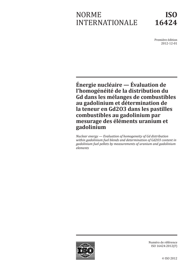 L'ISO 16424:2012 spécifie une méthode d'évaluation de l'homogénéité de la distribution du Gd dans les mélanges de combustibles au gadolinium et de détermination de la teneur en Gd2O3 dans les pastilles combustibles frittées de Gd2O3+UO2 allant de 1 % à 10 %, par mesurage des éléments gadolinium (Gd) et uranium (U) en utilisant la méthode de spectrométrie par émission atomique à plasma à couplage inductif (ICP-AES). Après mesurage des éléments Gd et U en utilisant la méthode ICP-AES, si la méthodologie statistique est en outre appliquée, l'homogénéité de la distribution du Gd dans un lot de pastilles combustibles au Gd peut également être évaluée. Cependant, l'ISO 16424:2012 ne couvre la méthodologie statistique que sur une base restreinte.