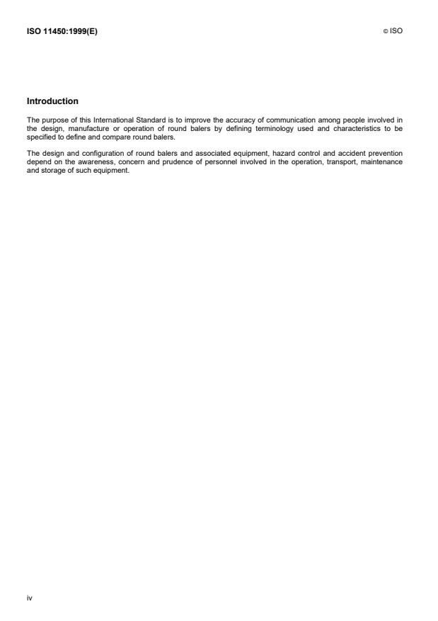 ISO 11450:1999 defines terminology and commercial specifications for round balers - machines that form compressed cylindrical bales of agricultural crop (round bales). The standard improves clarity and consistency in design, manufacture, specification and communication about round balers by specifying terms, classes, measurement methods and minimum data to be supplied in commercial literature.