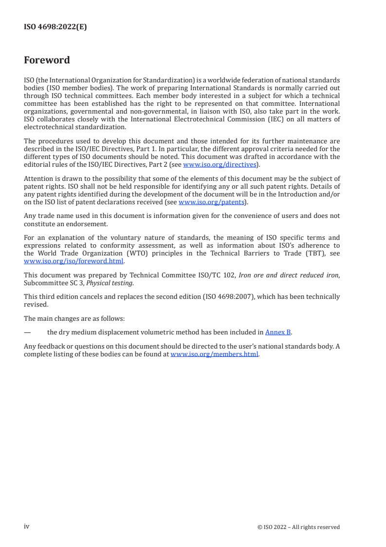 ISO 4698:2022 is a standard published by the International Organization for Standardization (ISO). Its full title is "Iron ore pellets for blast furnace feedstocks - Determination of the free-swelling index". This standard covers: This document specifies a method to provide a relative measure for evaluating the increase in volume of iron ore pellets, when reduced in an unconstrained bed under conditions resembling those prevailing in the reduction zone of a blast furnace. It specifies the determination of the free-swelling index. This document is applicable to hot-bonded pellets.
