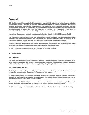 ISO 17315:2014 - "Petroleum products and other liquids - Ethanol - Determination of total acidity by potentiometric titration" specifies a laboratory test method to determine the total acidity of ethanol. The method uses potentiometric titration with a standardized NaOH solution and reports acidity as acetic acid mass (mg) per litre of ethanol or as mass percent (% m/m) when the ethanol density is known. The procedure is designed for fuel-grade and industrial ethanol where low acid content is critical to prevent corrosion and ensure product quality.