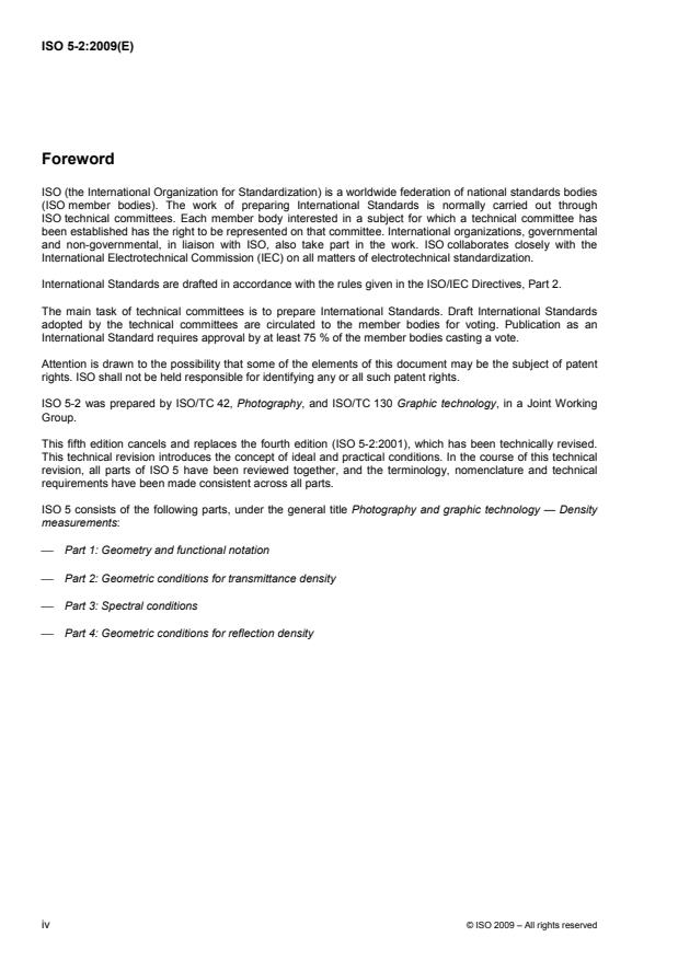 ISO 5-2:2009, part of the ISO 5 series on density measurements, specifies the geometric conditions for measuring transmittance density (the negative log10 of transmittance) in photography and graphic technology. The standard defines both ISO 5 standard diffuse transmittance density (opal-glass/diffuser based) and two ISO 5 standard projection transmittance densities identified by lens ƒ-numbers: ƒ/4.5 and ƒ/1.6. It introduces the distinction between ideal and realized parameters, and includes conformance rules and normative guidance on diffusion measurement.