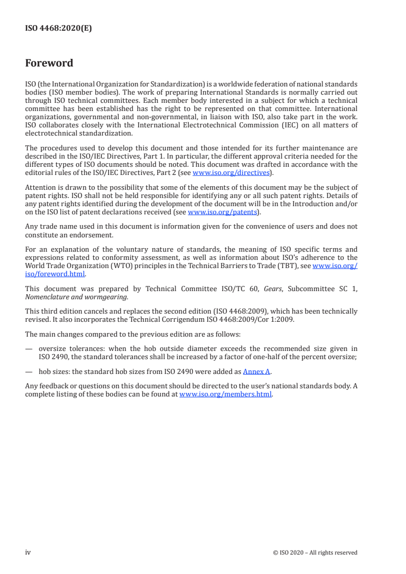 ISO 4468:2020 is a standard published by the International Organization for Standardization (ISO). Its full title is "Gear hobs - Accuracy requirements". This standard covers: This document specifies requirements for the accuracy of general-purpose hobs of 0,5 module to 40 module. These hobs are intended for producing gears which conform to ISO 53 and ISO 54. This document applies to hobs for spur and helical gears. It applies to solid (monobloc) and inserted blade hobs. The elemental features of hobs are graded according to accuracy, as follows: - Grade 4A; - Grade 3A; - Grade 2A; - Grade A; - Grade B; - Grade C; - Grade D. Grade 4A is the highest order of precision. In addition to the elemental tests for hobs, this document gives permitted tolerances for composite tests that are taken along the cutting edges on the line of action. The two groups of tests are not equivalent and one can choose between one or the other. If there was no previous agreement, the hob is regarded as belonging to the precision class specified if it satisfies one or the other of the two methods of inspection. NOTE The tolerances in this document were determined for gear hobs whose dimensions conform to ISO 2490, but with certain precautions they can be applied to hobs not specified in this document.
