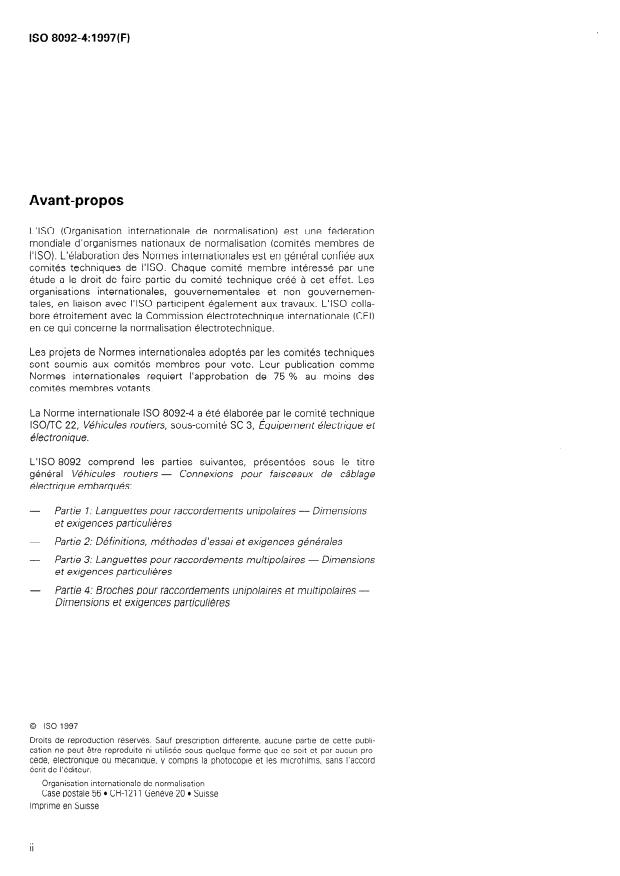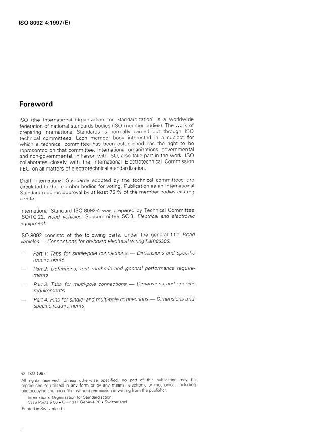 ISO 8092-4:1997 is a standard published by the International Organization for Standardization (ISO). Its full title is "Road vehicles - Connections for on-board electrical wiring harnesses - Part 4: Pins for single- and multi-pole connections - Dimensions and specific requirements". This standard covers: Specifies dimensions for the pins of single- and multi-pole connections and specific requirements, for on-board electrical wiring harnesses of road vehicles. Applies to connections designed to be disconnected after mounting in the vehicle in the case of repair and/or maintenance only.