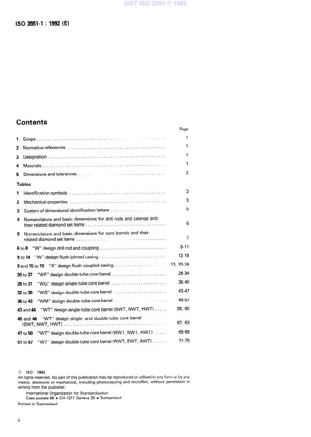 ISO 3551-1:1992 is a standard that establishes the naming conventions and dimensions for rotary core diamond drilling equipment. It aims to ensure that different components within System A of this equipment are interchangeable. The standard covers various equipment, including drill rods, couplings, casings, casing couplings, casing bits, casing shoes, drive shoes, casing ream shells, core barrels, core bits, core lifters, and reaming shells. The equipment is designed for drilling holes with diameters ranging from 30 mm to 200 mm and yielding cores with diameters from 18.5 mm to 165 mm.
