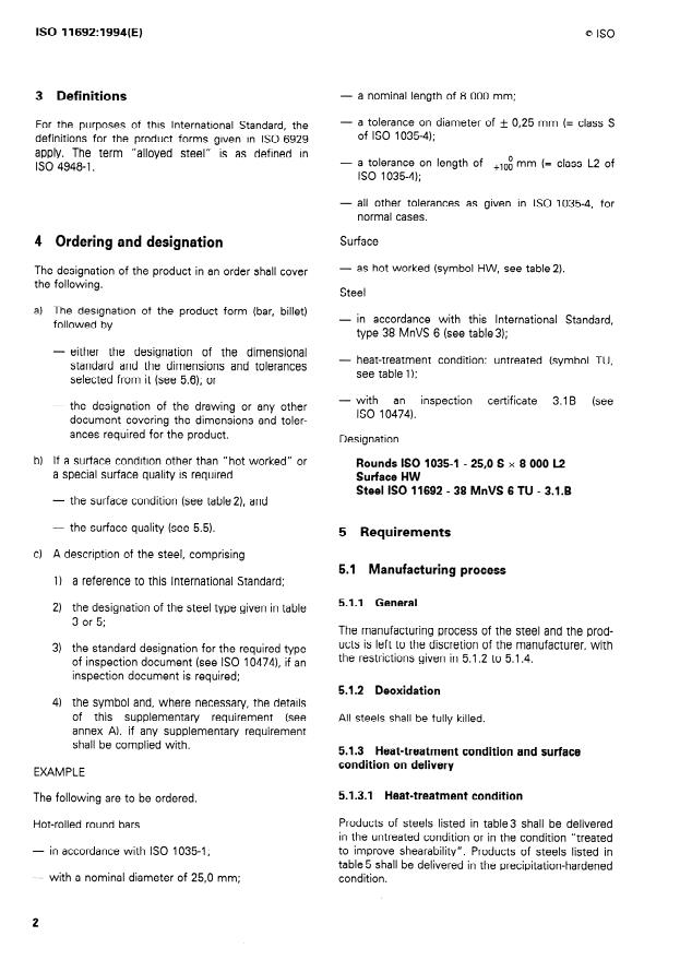 ISO 11692:1994 is a standard published by the International Organization for Standardization (ISO). Its full title is "Ferritic-pearlitic engineering steels for precipitation hardening from hot-working temperatures". This standard covers: Specifies the technical delivery requirements for billets and bars made of specific alloyed steels. In special cases, variations in these technical delivery requirements or additions to them may form the subject of an agreement at the time of enquiry and order. In addition, the general technical delivery requirements of ISO 404 are applicable.