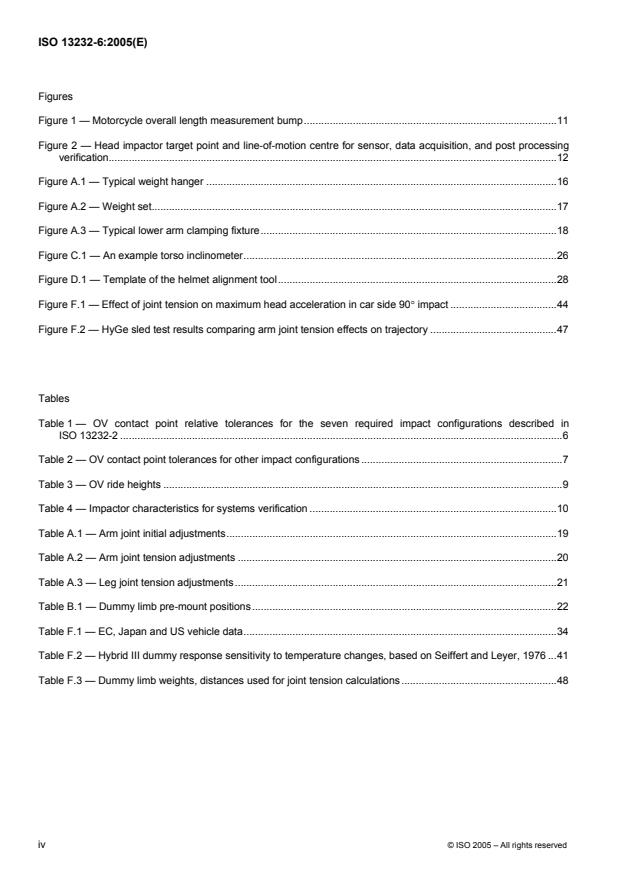 ISO 13232-6:2005 specifies minimum requirements for: paired comparison tests; the preparation of the dummy, motorcycle and opposing vehicle; the repeatability and reproducibility of impact test conditions within and between test sites; the minimization of variation in secondary test variables; realistic and representative impact conditions for full-scale impact tests; and a means to verify analytical evaluations of proposed rider crash protective devices fitted to motorcycles, such as computer simulation. ISO 13232 specifies the minimum requirements for research into the feasibility of protective devices fitted to motorcycles, which are intended to protect the rider in the event of a collision. ISO 13232 is applicable to impact tests involving: two-wheeled motorcycles; the specified type of opposing vehicle; either a stationary and a moving vehicle or two moving vehicles; for any moving vehicle, a steady speed and straight-line motion immediately prior to impact; one helmeted dummy in a normal seating position on an upright motorcycle; the measurement of the potential for specified types of injury by body region; evaluation of the results of paired impact tests (i.e. comparisons between motorcycles fitted and not fitted with the proposed devices); and evaluation of inflatable/triggered protective device. ISO 13232-6 does not apply to testing for regulatory or legislative purposes.