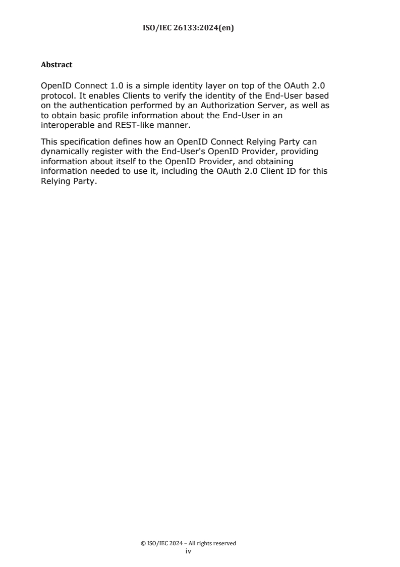 ISO/IEC 26133:2024 is a standard published by the International Organization for Standardization (ISO). Its full title is "Information technology - OpenID connect - OpenID connect dynamic client registration 1.0 incorporating errata set 2". This standard covers: OpenID Connect 1.0 is a simple identity layer on top of the OAuth 2.0 protocol. It enables Clients to verify the identity of the End-User based on the authentication performed by an Authorization Server, as well as to obtain basic profile information about the End-User in an interoperable and REST-like manner. This document defines how an OpenID Connect Relying Party can dynamically register with the End-User's OpenID Provider, providing information about itself to the OpenID Provider, and obtaining information needed to use it, including the OAuth 2.0 Client ID for this Relying Party.