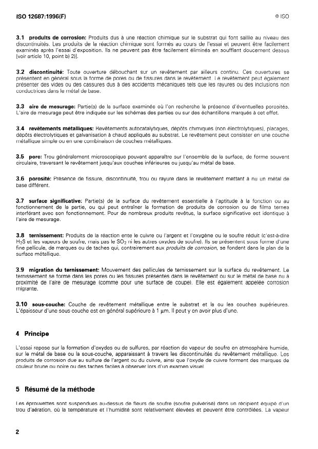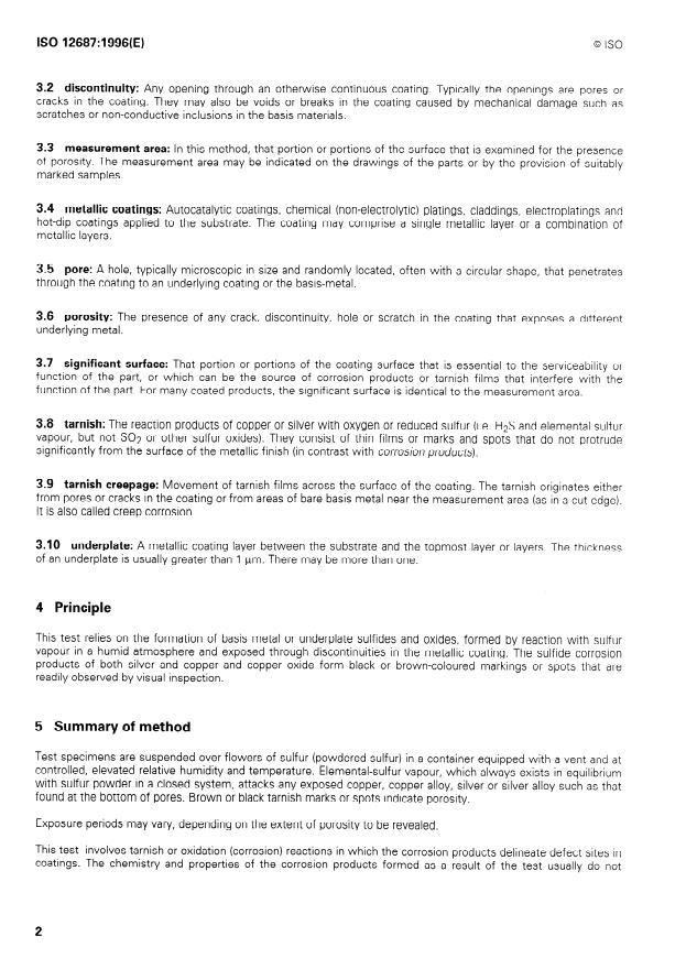 ISO 12687:1996 is a standard published by the International Organization for Standardization (ISO). Its full title is "Metallic coatings - Porosity tests - Humid sulfur (flowers of sulfur) test". This standard covers: Specifies a method of revealing discontinuities and porosity in metallic coatings, where they penetrate the coating layer down to a substrate. Especially useful for coatings consisting of single or combined layers.