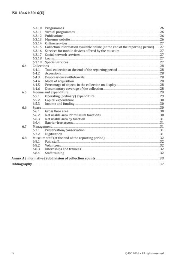 ISO 18461:2016은 박물관 커뮤니티에 대한 통계 수집 및 보고에 관한 규칙을 명시하고 있습니다. 이 표준은 박물관이 사용자에게 제공하는 모든 자원과 서비스 유형에 대한 정의와 계수 절차를 제공합니다. 이 국제표준에서 명시된 측정 항목들이 다양한 유형과 크기의 박물관에서 수집될 수 없는 경우도 인정됩니다. 목표는 특정 통계를 수집할 때 동일한 정의와 방법을 사용할 수 있도록 보장하는 것입니다. ISO 18461:2016은 이에 명시되지 않은 방법의 사용을 배제하기 위한 것은 아닙니다. 세계적으로 다양한 종류의 박물관이 존재하며, 각각 다른 임무와 관객을 가지고 있으며, 독특한 특성 (구조, 기금, 거버넌스 등)과 여러 가지 상황 변인에 영향을 받습니다. 이러한 광범위한 차이 때문에 이 국제표준에서 설명된 방법이 모든 박물관에서 필요하거나 유용하지 않을 수도 있다는 점을 이해하는 것이 중요합니다.