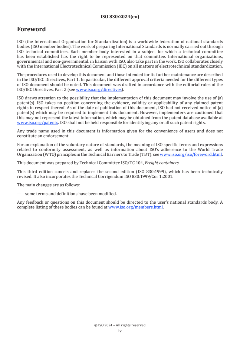 ISO 830:2024 is the third edition (published September 2024) of the ISO vocabulary standard for freight containers. It defines universally accepted terms and definitions used to describe container designation, characteristics, types, components, handling, identification and related concepts. This document replaces ISO 830:1999 and incorporates revisions to reflect the growth in container types, size/height variations and new terminology such as smart container and regional container variations. Note: component specifications are referenced to ISO 9897.