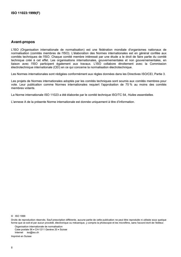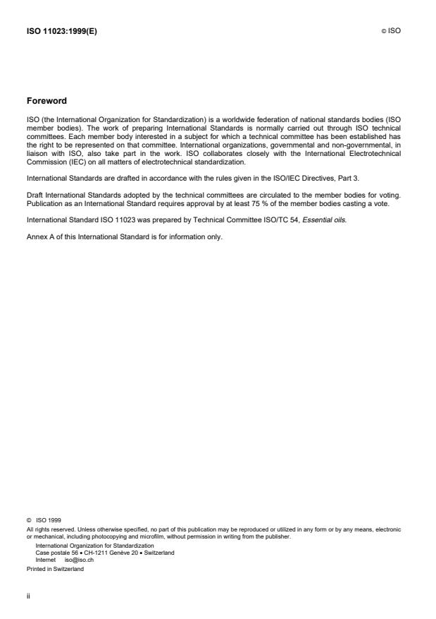 International Standard ISO 11023 was prepared by Technical Committee ISO/TC 54, Essential oils.