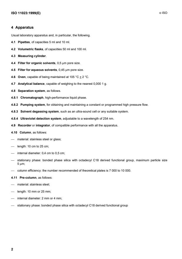- Column: C18 bonded silica (octadecyl), 10–25 cm length, 0.4–0.5 cm ID, particle size ≤ 5 µm, recommended efficiency 7 000–10 000 theoretical plates. Pre-column recommended.