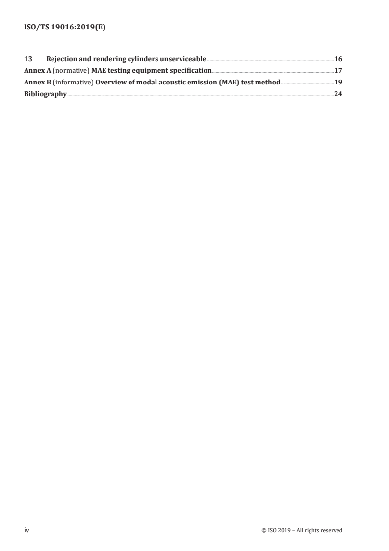 ISO/TS 19016:2019 is a technical specification published by the International Organization for Standardization (ISO). Its full title is "Gas cylinders - Cylinders and tubes of composite construction - Modal acoustic emission (MAE) testing for periodic inspection and testing". This standard covers: This document describes the use of modal acoustic emission (MAE) testing during periodic inspection and testing of hoop wrapped and fully wrapped composite transportable gas cylinders and tubes, with aluminium-alloy, steel or non-metallic liners or of linerless construction, intended for compressed and liquefied gases under pressure. This document addresses the periodic inspection and testing of composite cylinders constructed to ISO 11119‑1, ISO 11119‑2, ISO 11119‑3, ISO 11515 and ISO/TS 17519 and can be applied to other composite cylinders designed to comparable standards when authorized by the competent authority. Unless noted by exception, the use of "cylinder" in this document refers to both cylinders and tubes.